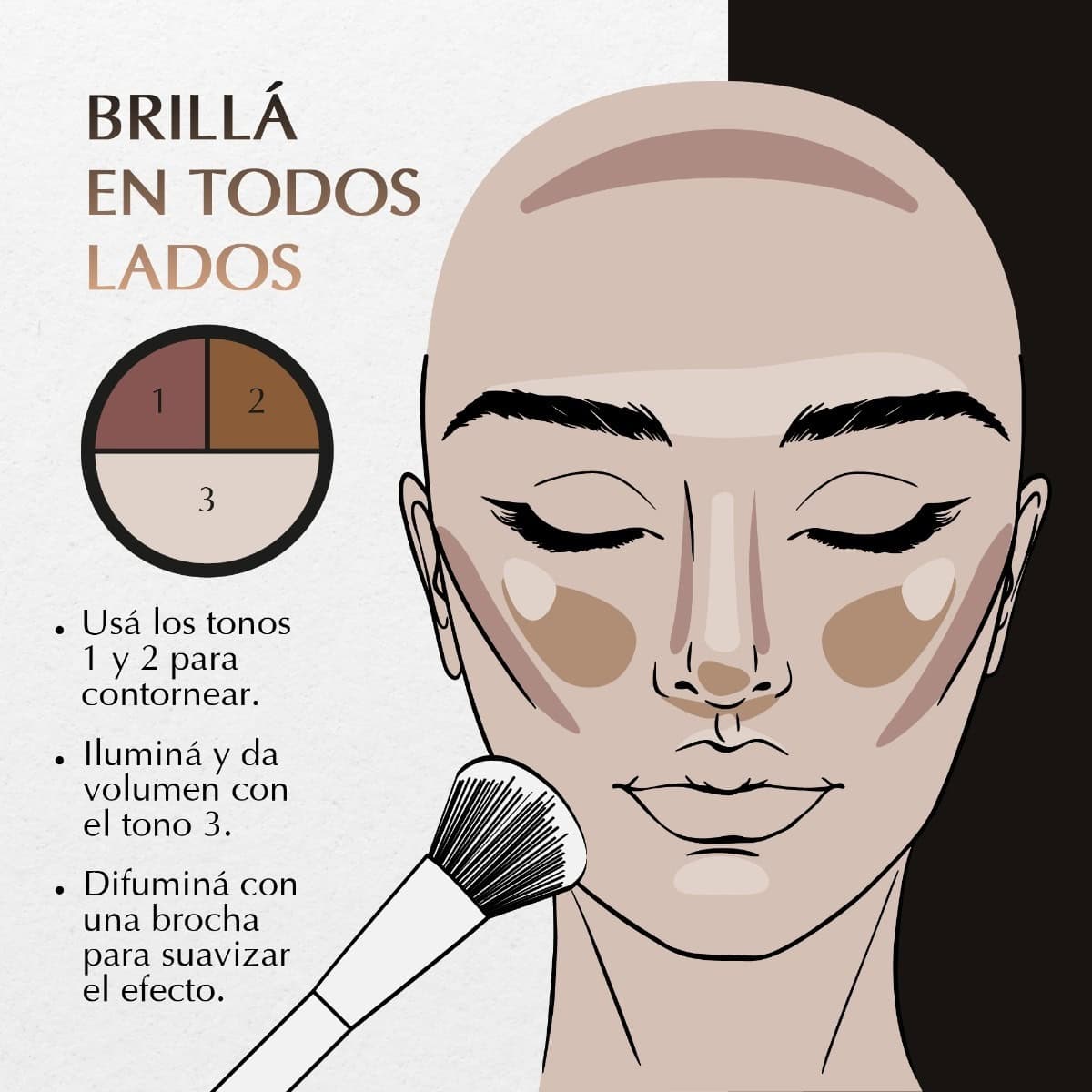 Aplicalo con una brocha de precisión preferentemente en forma de abanico ya que con ella podrás marcar tus pómulos y mentón de manera impecable. Esta brocha te ayudará a disminuir la línea de intersección entre el claro y el oscuro de tus pómulos, difuminando el colorete y el polvo bronceador.